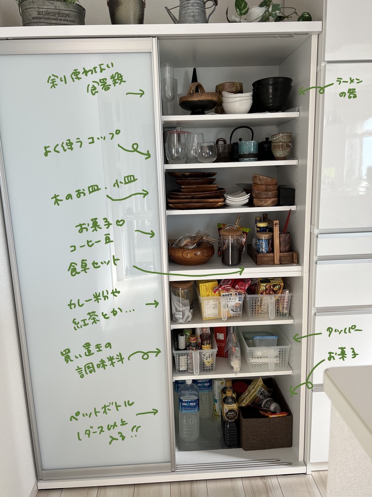 右側には、食器やコップ類、箸立て等のテーブルセット、調味料のストックやペットボトル等…etc。