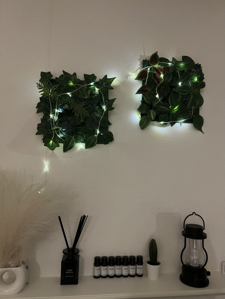 とりあえず使い道に困っていた電池式のLEDのイルミライトを掛けてみたら素敵になりました✨
