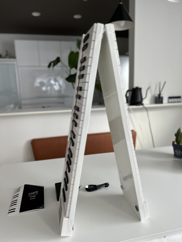 広げると88鍵盤あるので長いです。折りたたんだ状態でも弾けるので、片手練習してもいいし、好きな場所でテープルの上でも広げて弾けるのでピアノライフが楽しくなりました。