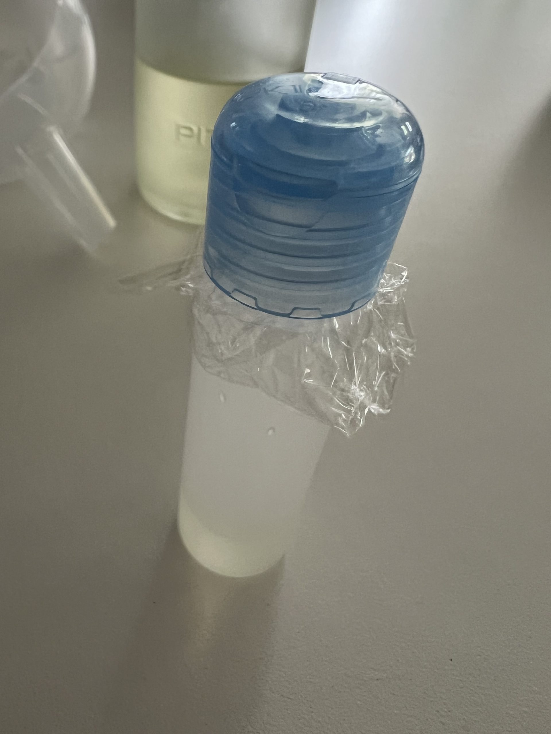前に100均のボトルに入れたとき、飛行機の気圧で蒸発?したりこぼれてしまった経験があり、それからは怖くて入れ替えて持ち歩くことをしなくなったんですが、やっぱり重たくなるので今回はサランラップを活用して工夫しました。